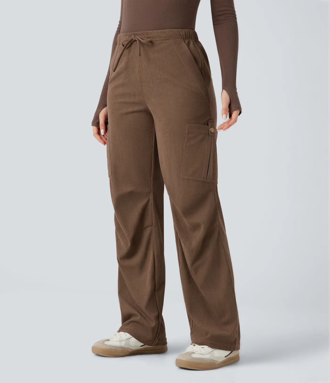 $39.95 USDLässige Cargohose aus Cord mit mittelhohem Bund, mehreren Taschen, Kordelzug und geradem Bein