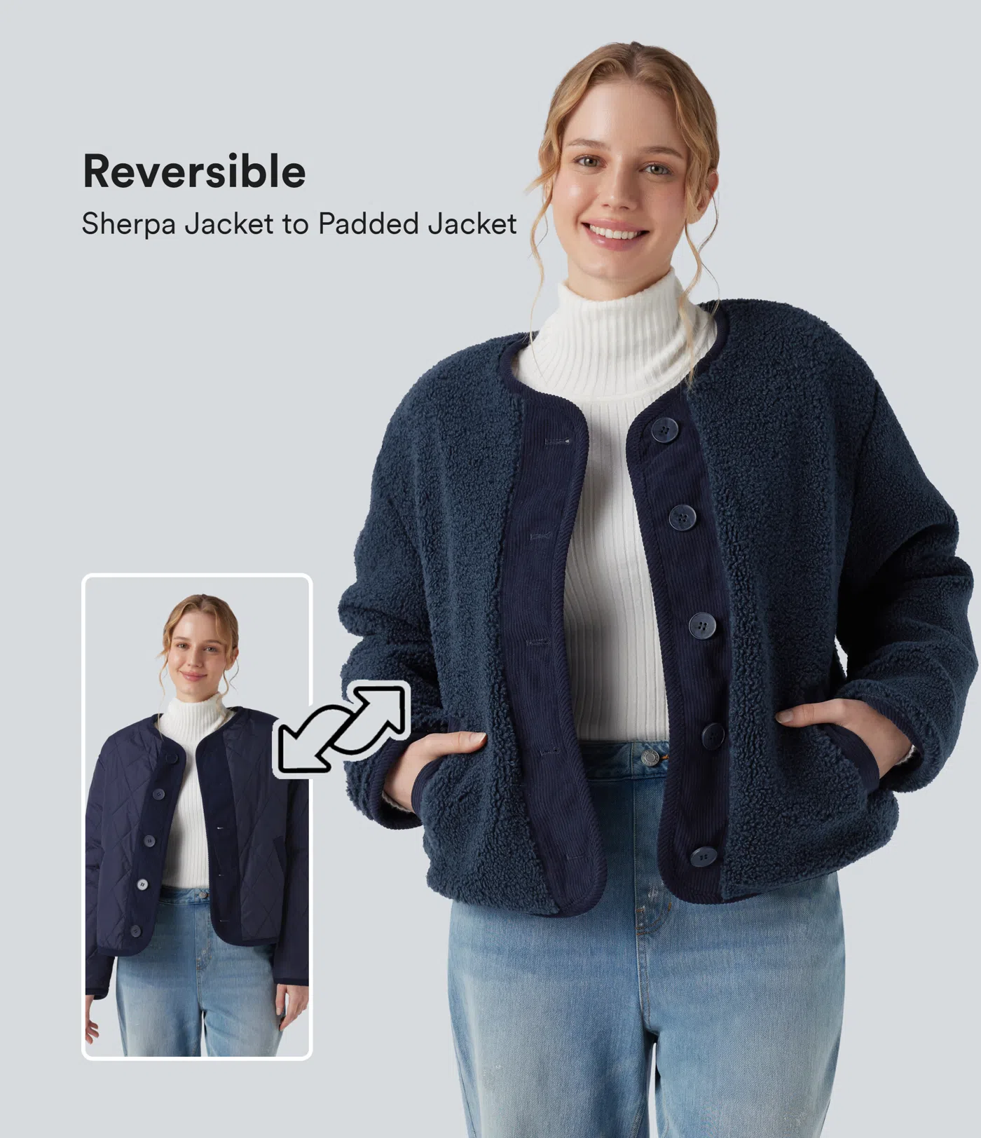 Sale-71%$25.95 USD$89.95 USD005Sherpa-Jacke mit Seitentaschen und langen Ärmeln - beidseitig tragbar (Zwei Looks in einem)