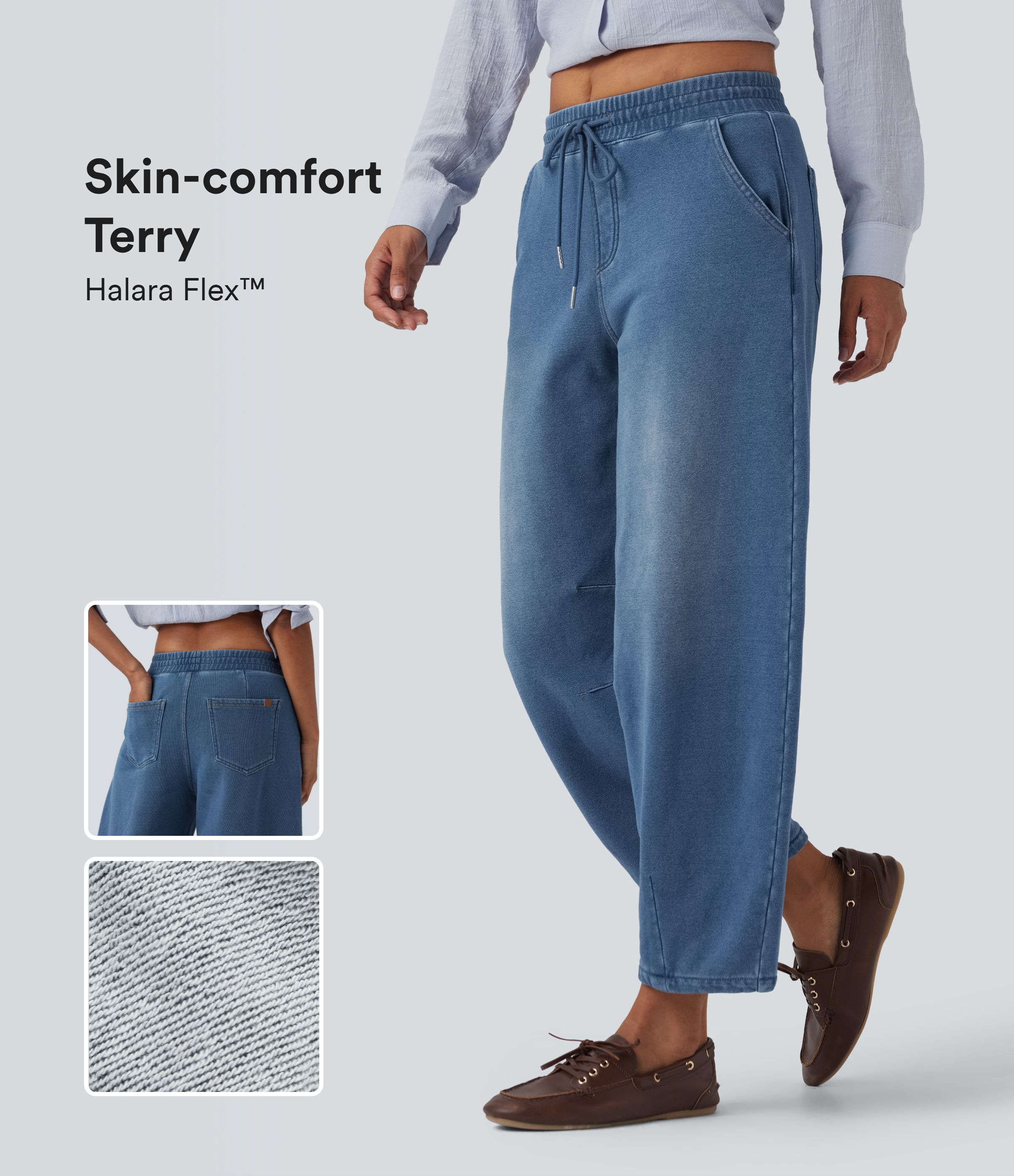 Halara Flex™ - Lässige Denimjoggers mit mittelhohem Bund, Seitentaschen, Kordelzug und Barrel-Leg