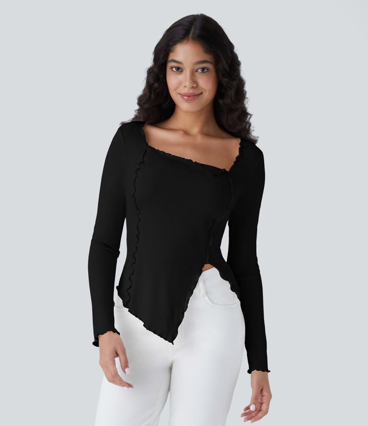 Geripptes Strickoberteil mit quadratischem Ausschnitt, Salatbesatz und asymmetrischem Saum