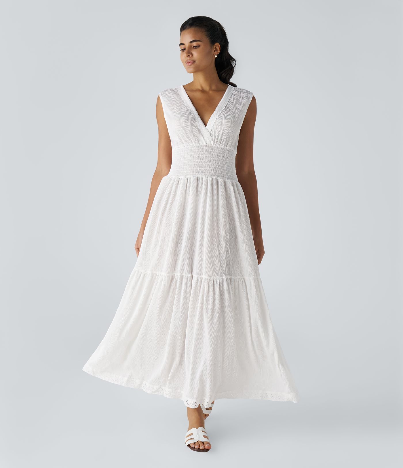Ärmelloses Maxikleid mit V-Ausschnitt, gerafften Falten und ausgestelltem Bein