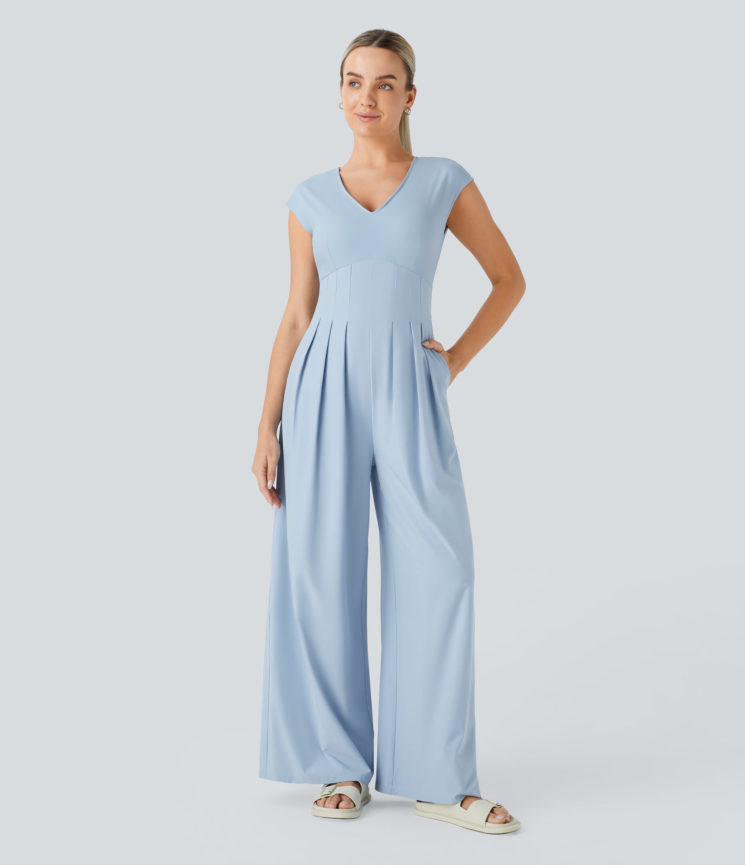 Breezeful™ Plissierter Jumpsuit mit V-Ausschnitt, Reißverschluss, Seitentaschen und weitem Bein - schnelltrocknend