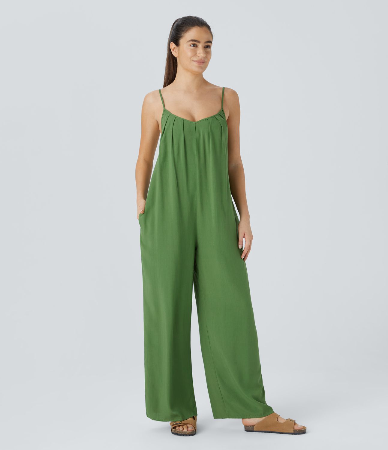 Rückenfreier, lässiger Jumpsuit mit verstellbaren Trägern, Seitentaschen und weitem Bein