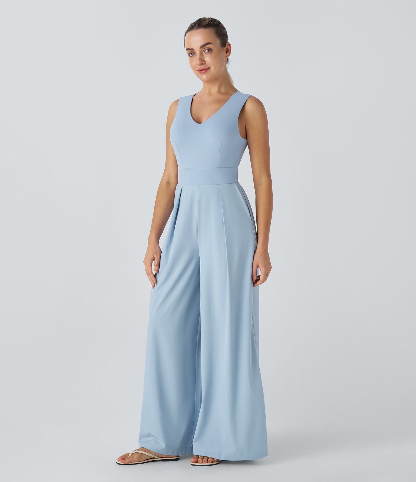 Breezeful™ Ärmelloser, plissierter Freizeit-Jumpsuit mit V-Ausschnitt, unsichtbarem Reißverschluss, Seitentaschen und weitem Bein - schnelltrocknend