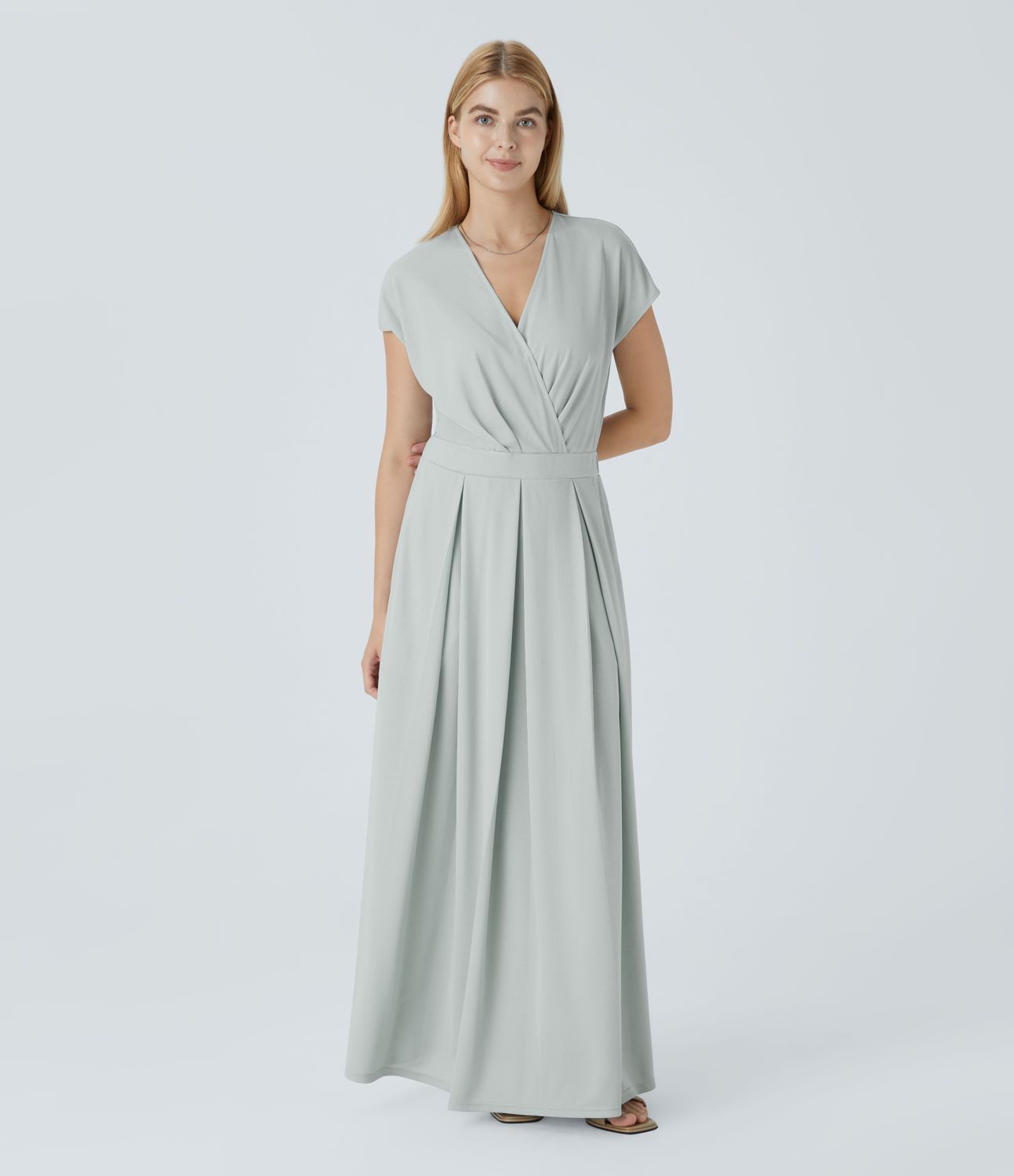 Plissiertes, fließendes Freizeit-Waffelkleid in Maxilänge mit V-Ausschnitt, kurzen, Ärmeln und Seitentaschen