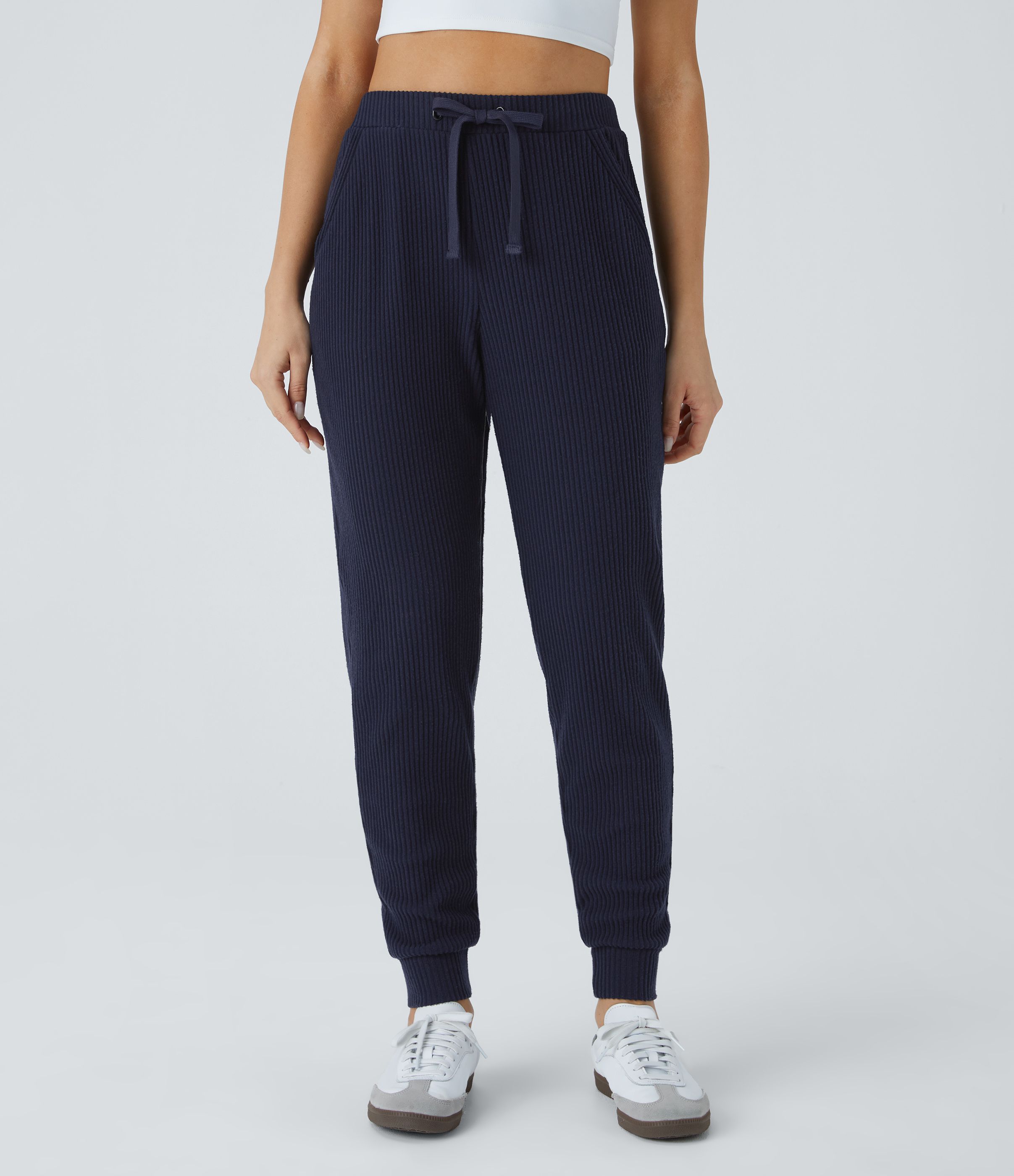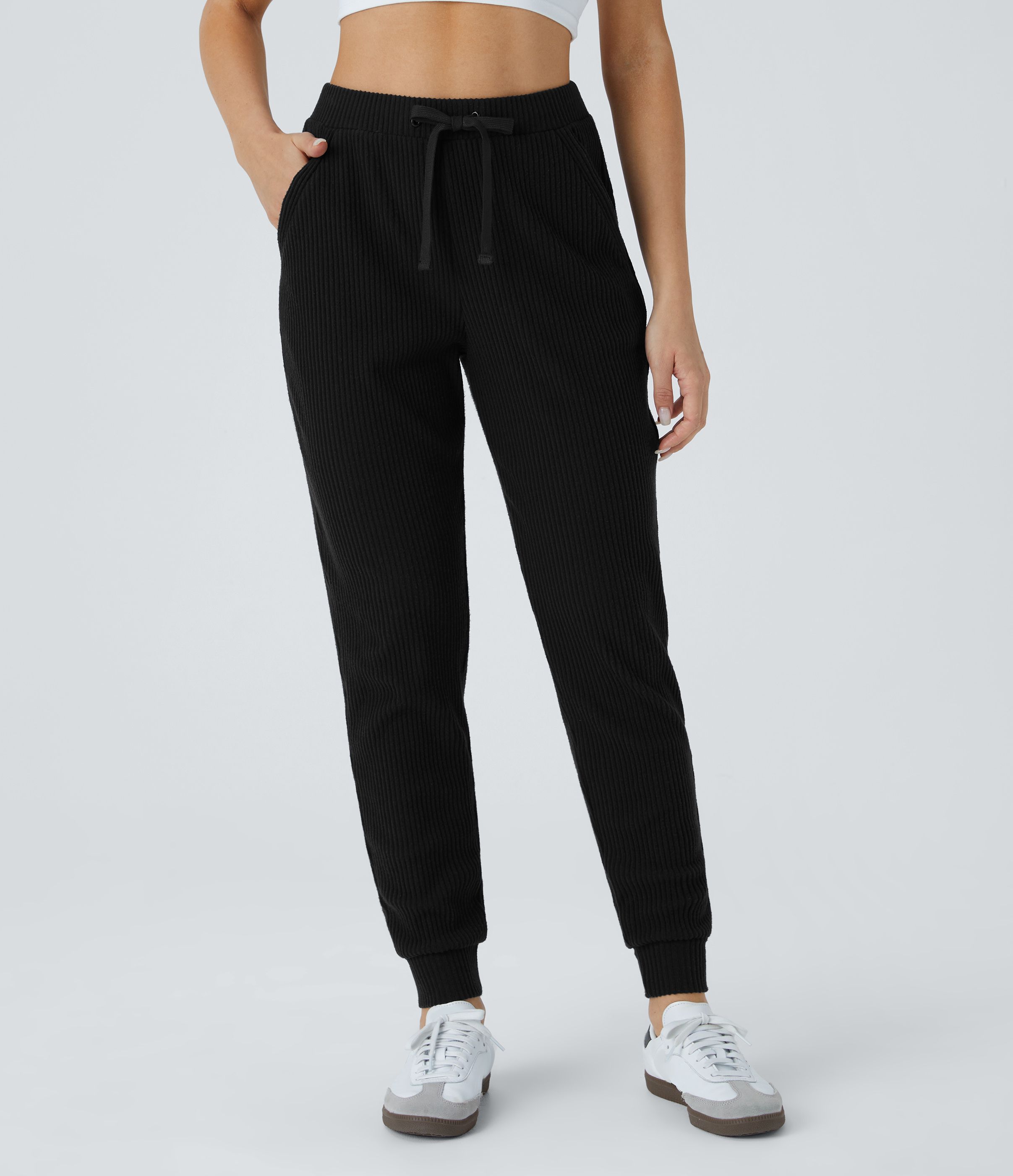 Lässige Jogginghose aus geripptem Strick mit mittelhohem Bund, Kordelzug und mehreren Taschen