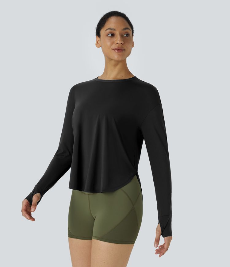 Yoga-Sport-Top mit Rundhalsausschnitt, Daumenloch, gefaltetem, abgerundetem Saum