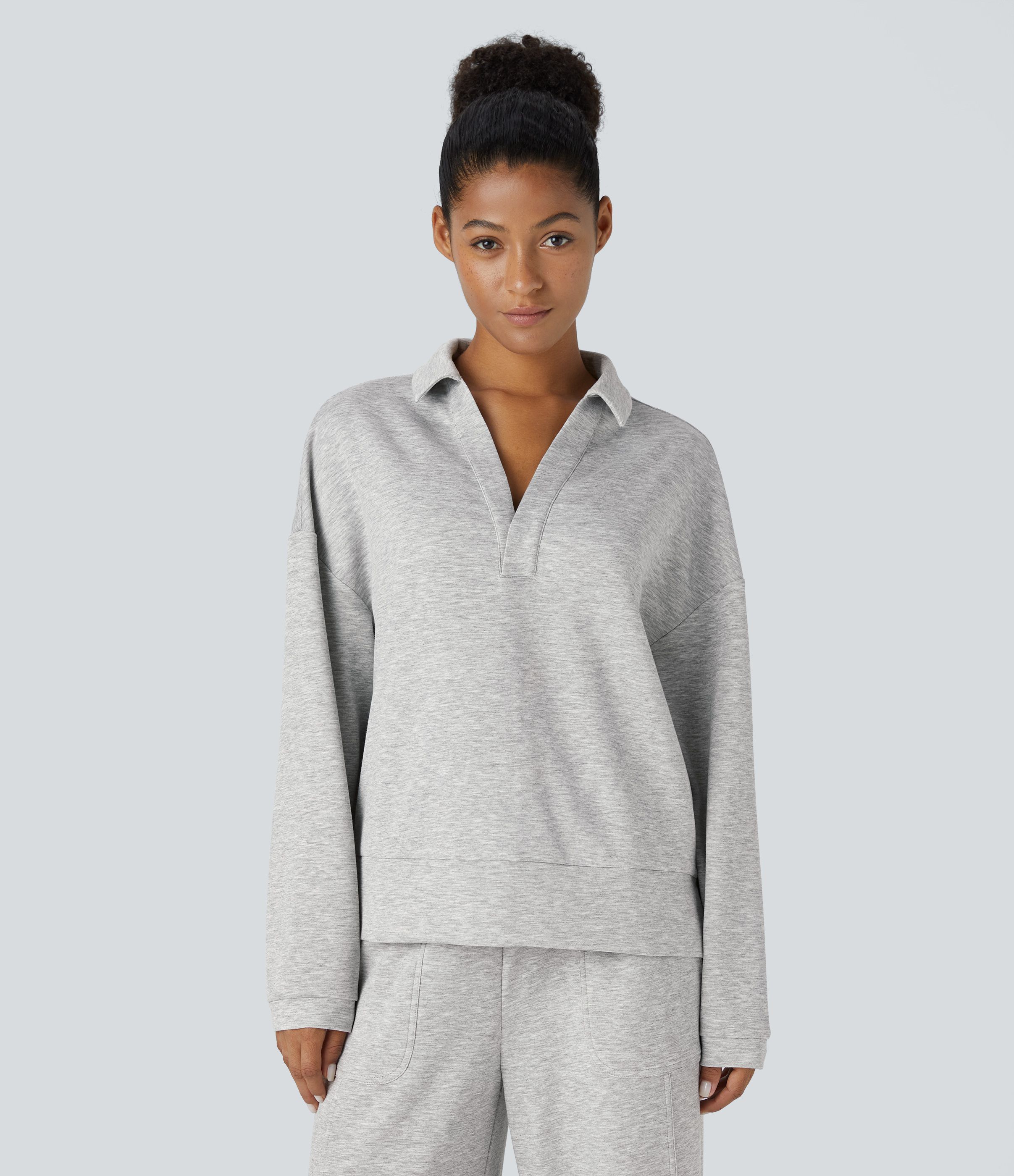 Poloshirt mit V-Ausschnitt, Knopfleiste, überschnittenen Schultern, langen Ärmeln, Schlitz, entspanntes Freizeit-Sweatshirt
