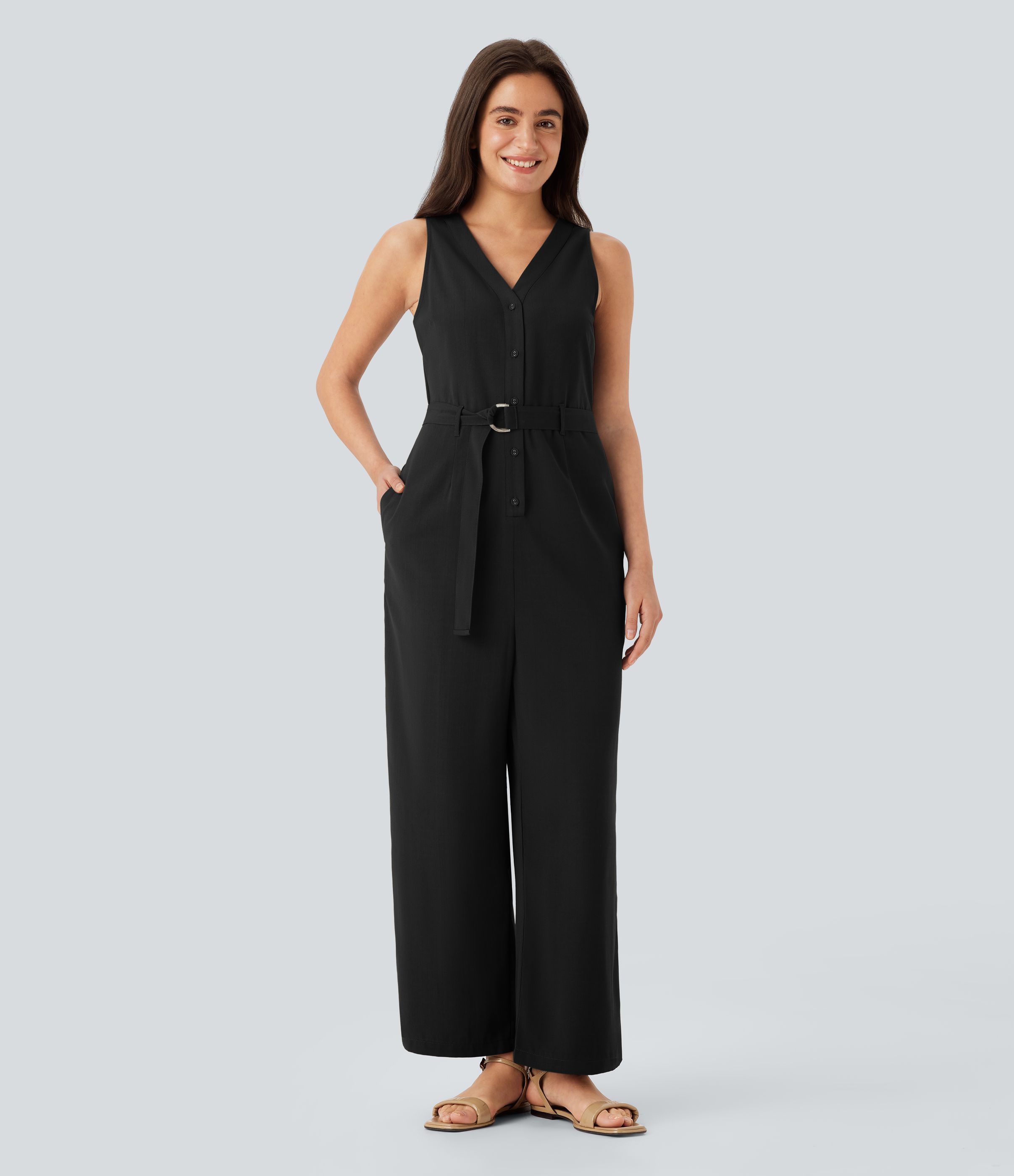 Lässiger, ärmelloser Jumpsuit mit V-Ausschnitt, Knopfleiste, Gürtel und Seitentaschen