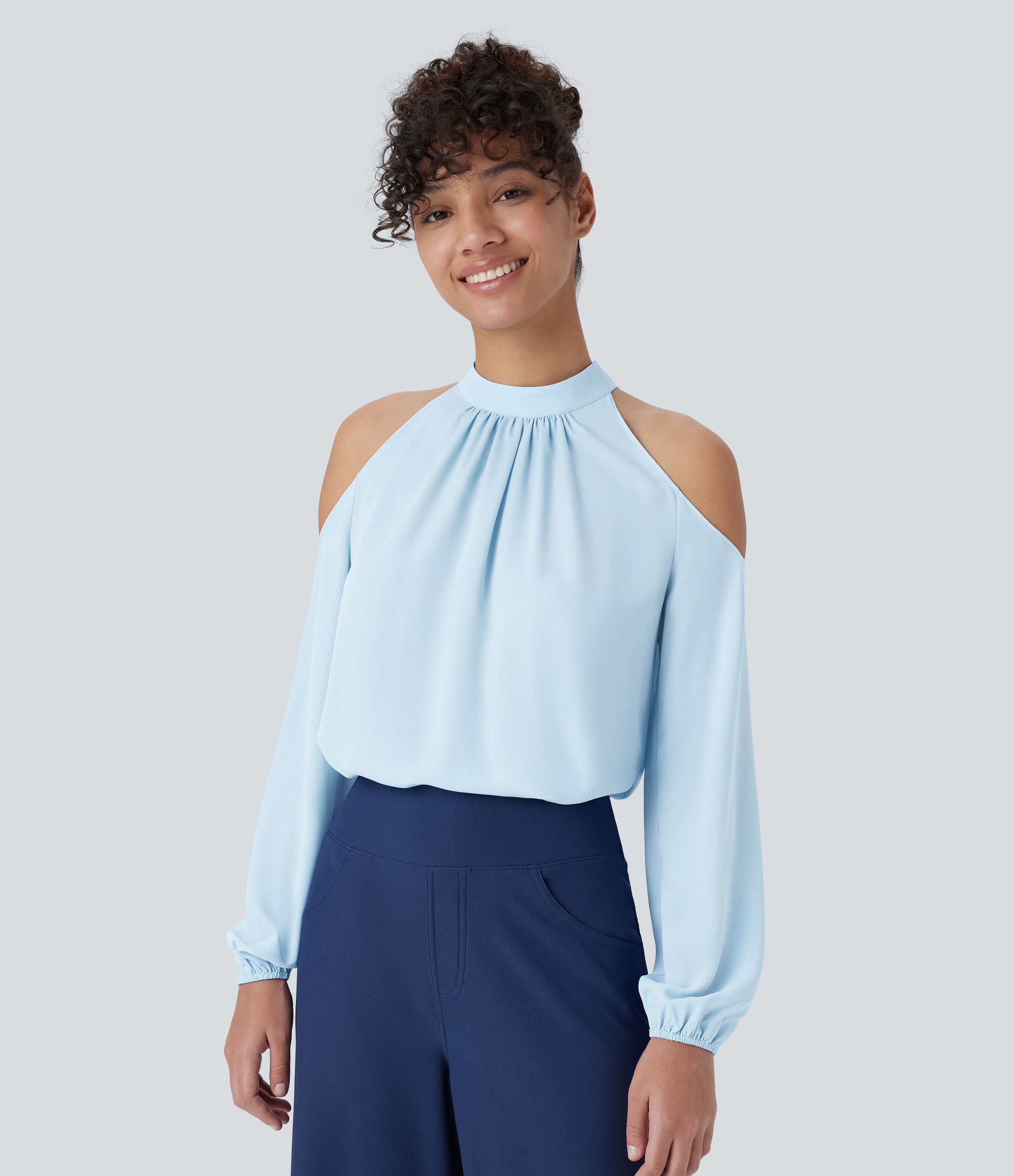 Lässige, schulterfreie Bluse mit Stehkragen, Knopfleiste und Bischofsärmeln