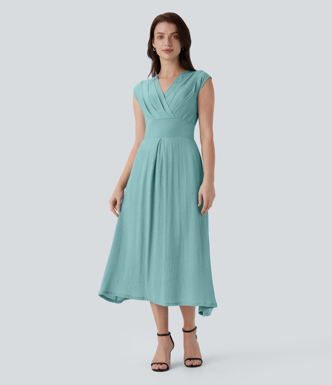 Fließendes Midi-Arbeitskleid mit V-Ausschnitt, überkreuzten Flügelärmeln, unsichtbarem Reißverschluss und Seitentasche