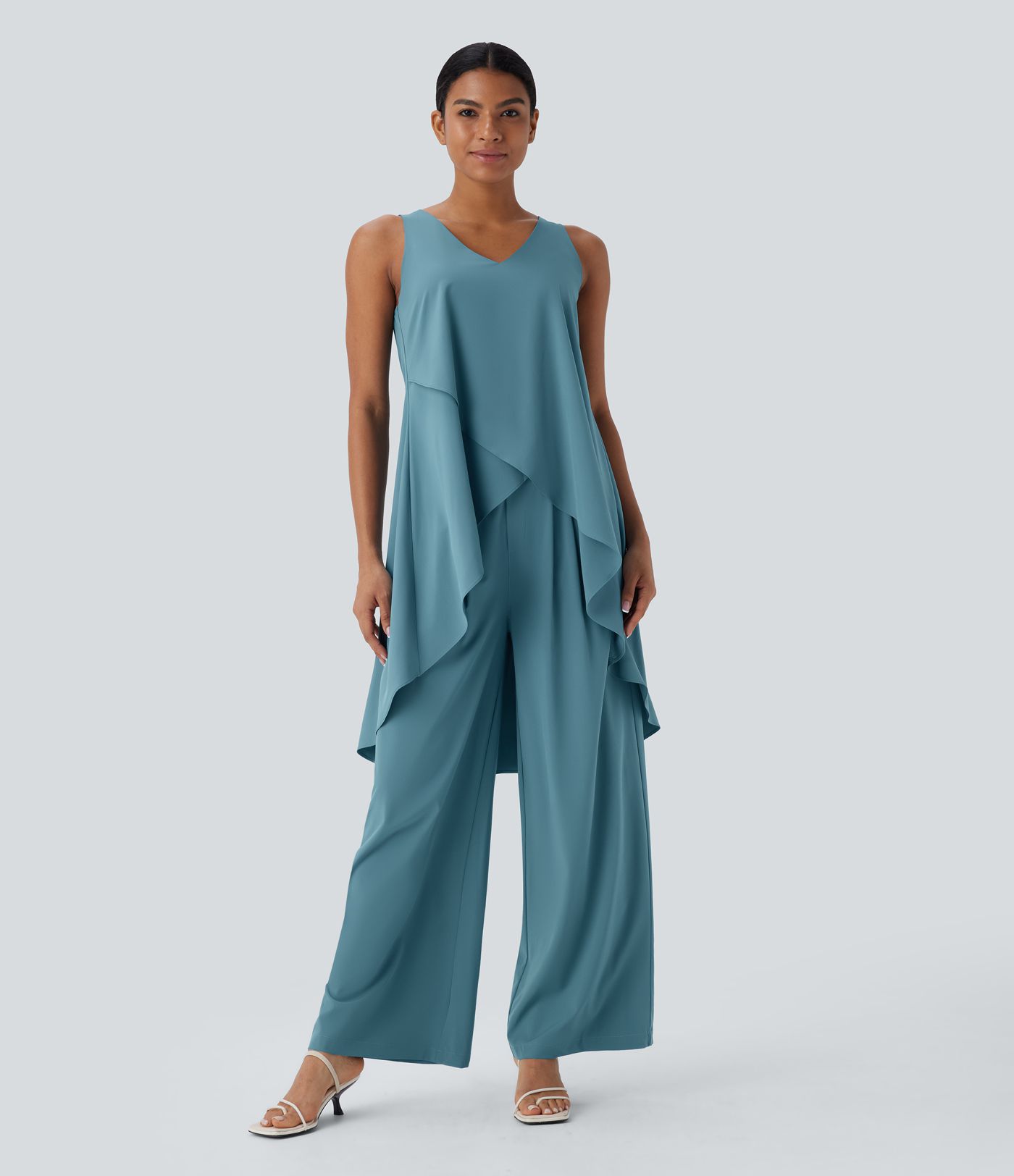 Débardeur long asymétrique Breezeful™ à col en V, avec volants et ourlet ondulé, séchage rapide