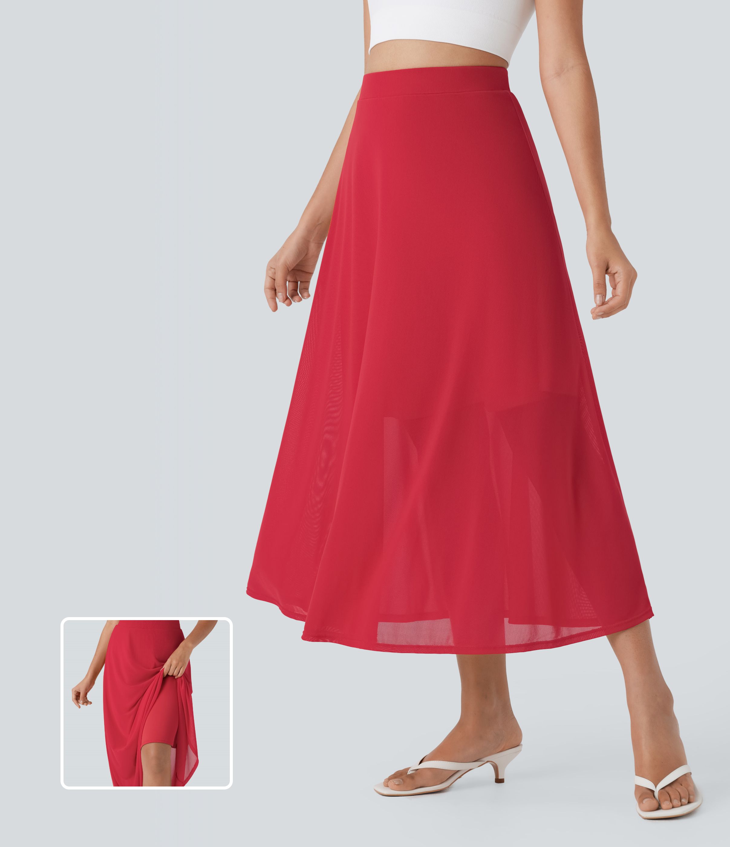 Fließender, ausgestellter Freizeit-Midirock mit hohem Bund und Netzstoff-Overlay