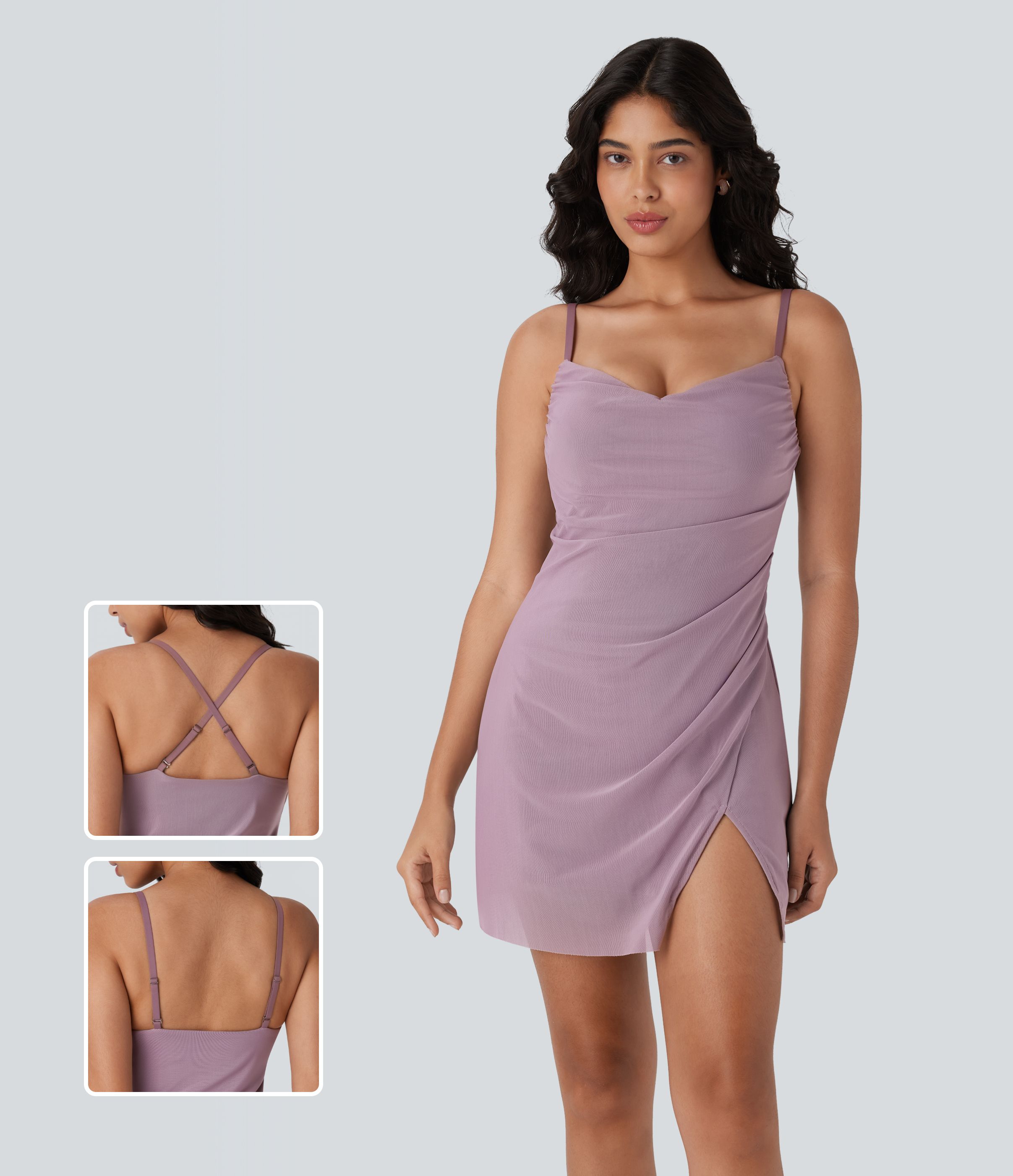 Rückenfreies, gerafftes Party-Minikleid mit überkreuzten Trägern, kontrastierendem Mesh und Schlitz