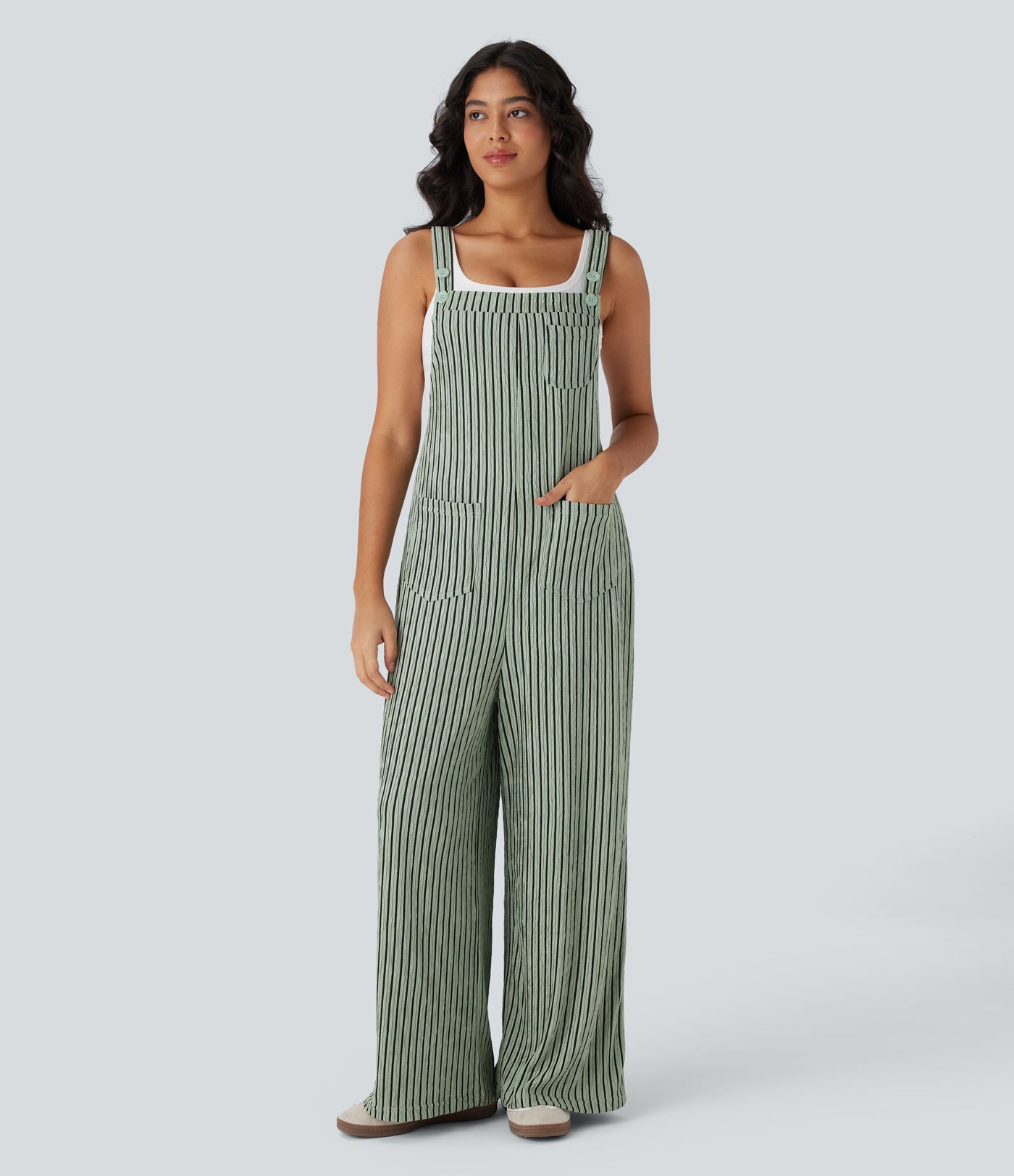 Gestreifter Freizeit-Overall mit mehreren Taschen, verstellbaren Trägern und Knöpfen