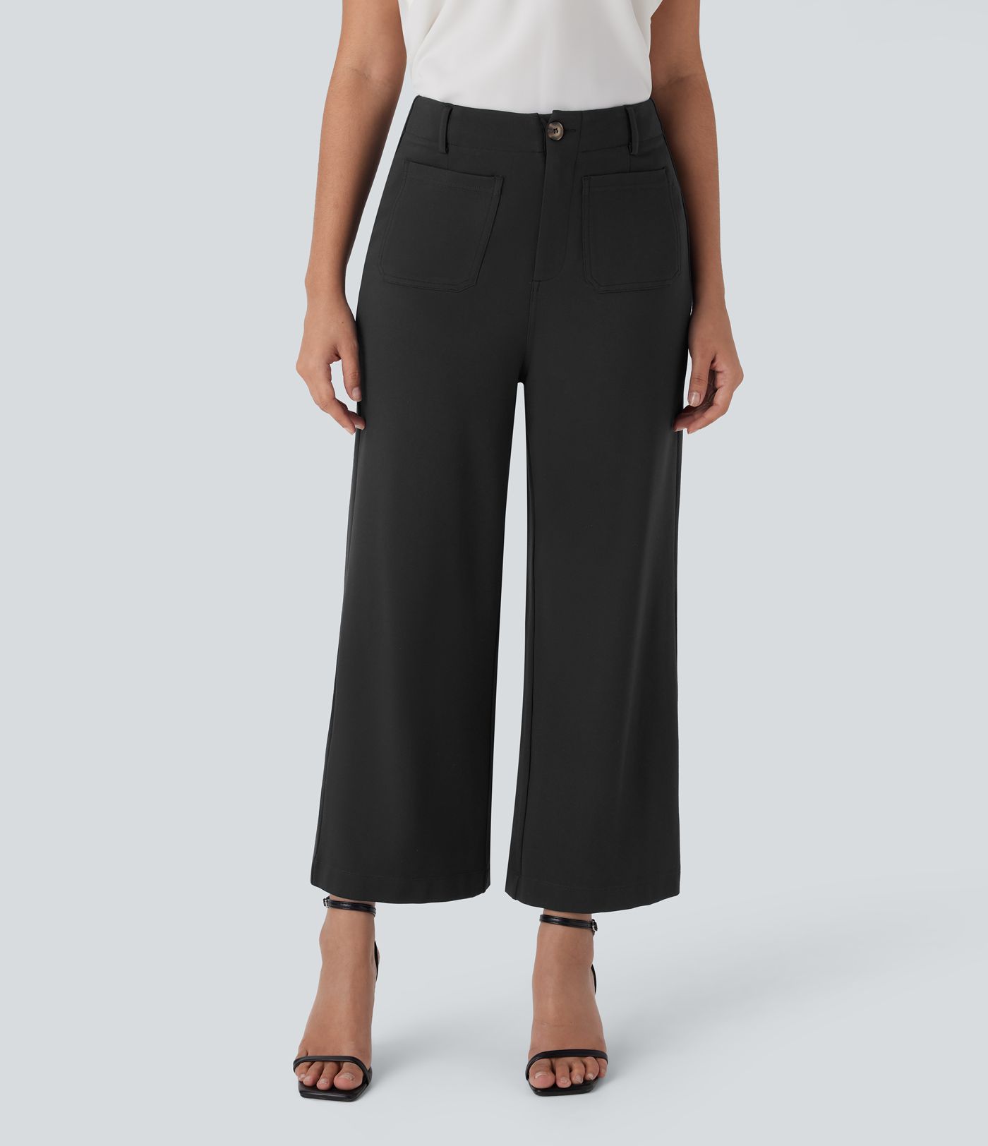 Stoffhose mit hohem Bund, mehreren Taschen, Knopf, Reißverschluss und weitem Bein