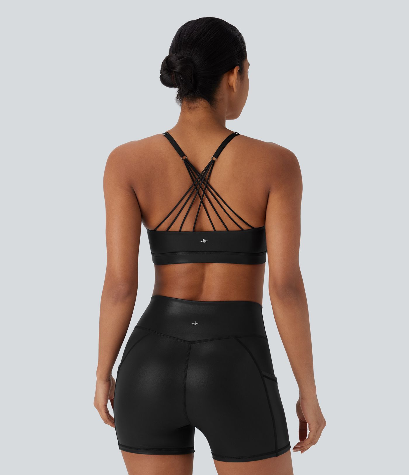 Rückenfreier Yoga-Sport-BH aus Kunstleder mit geringer Stützkraft und verstellbaren überkreuzten Trägern - schnelltrocknend