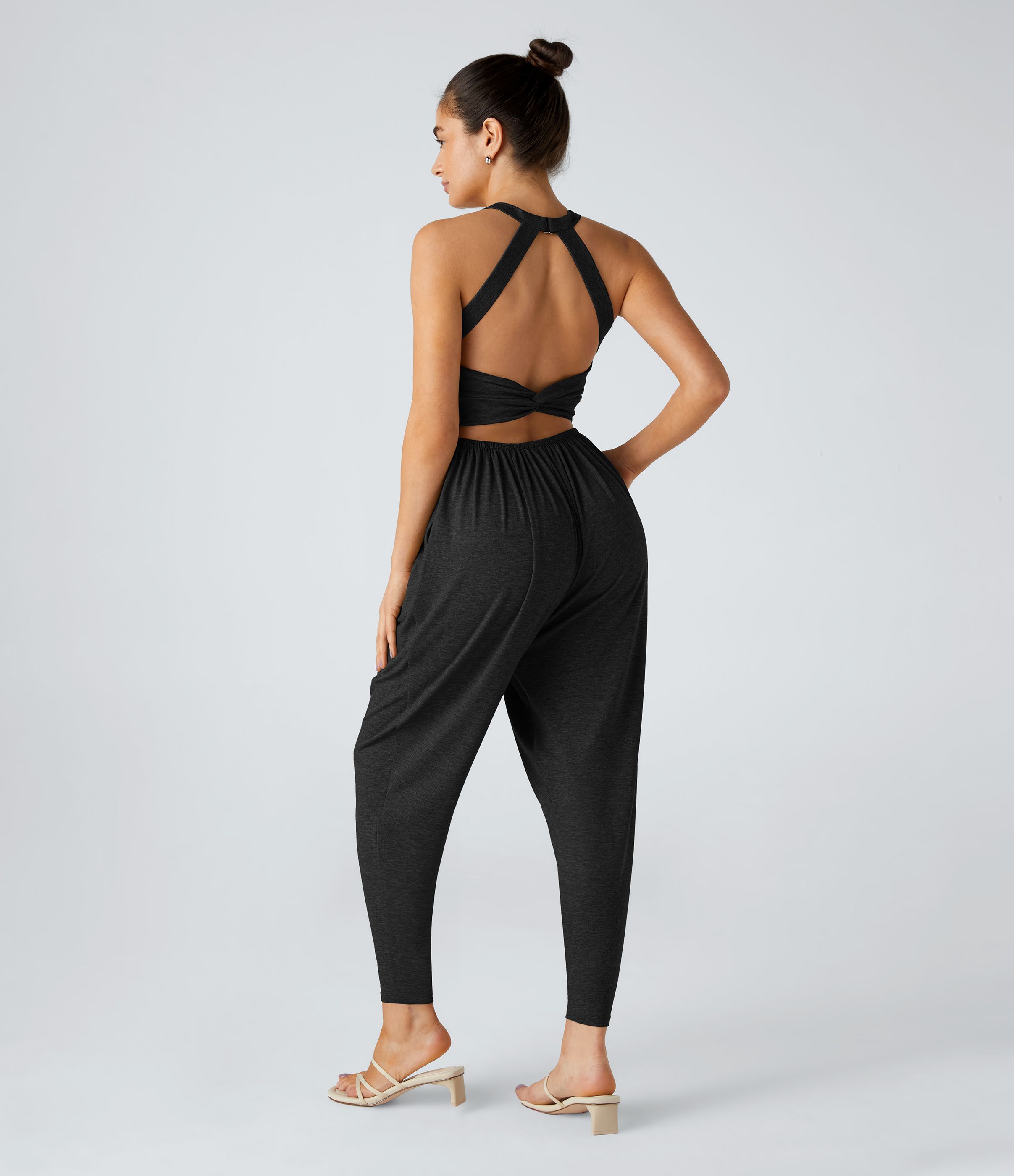 Rückenfreier, gedrehter U-Ausschnitt, Harems-Jumpsuit mit Seitentaschen