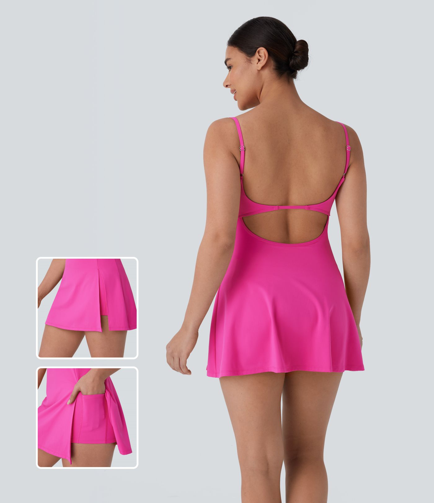 Rückenfreies 2-in-1 Pickleball-Slip-Minikleid mit Seitentaschen, verstellbaren Trägern und Schlitz