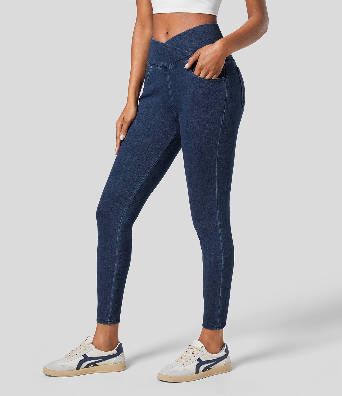 Halara Flex™ Denim Heat - 7/8-Leggings aus Denim mit hohem Crossover-Bund und Seitentaschen