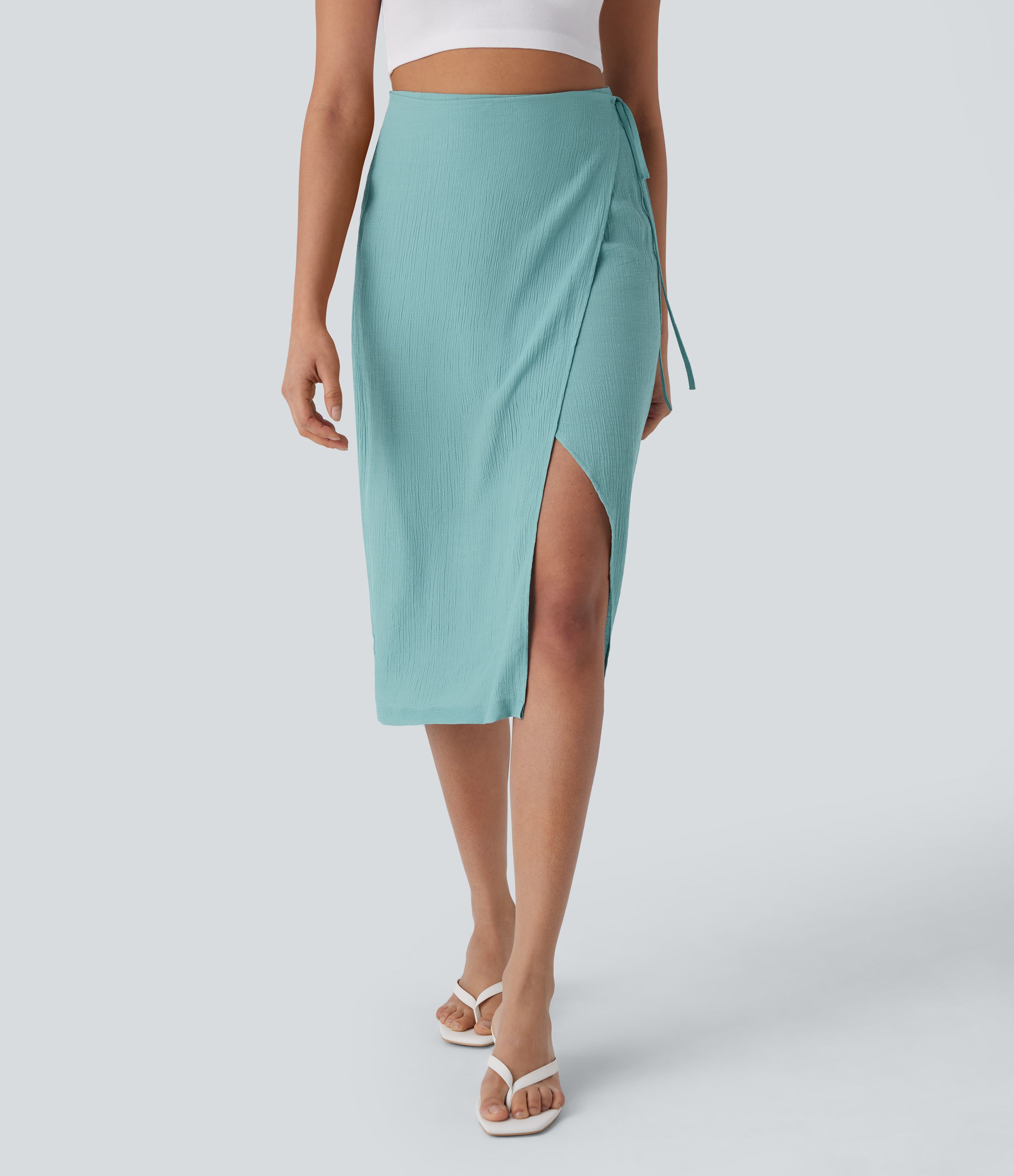 Lässiger Midirock mit hohem Bund, unsichtbarem Reißverschluss, Wickelbindung und seitlichem Schlitz