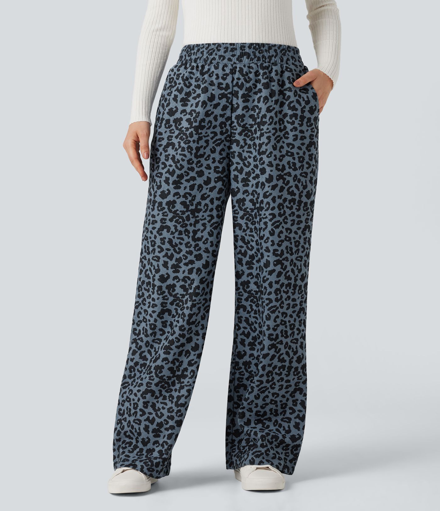 Lässige Baggy-Hose aus Cord mit hohem Bund, mehreren Taschen und Leopardenmuster