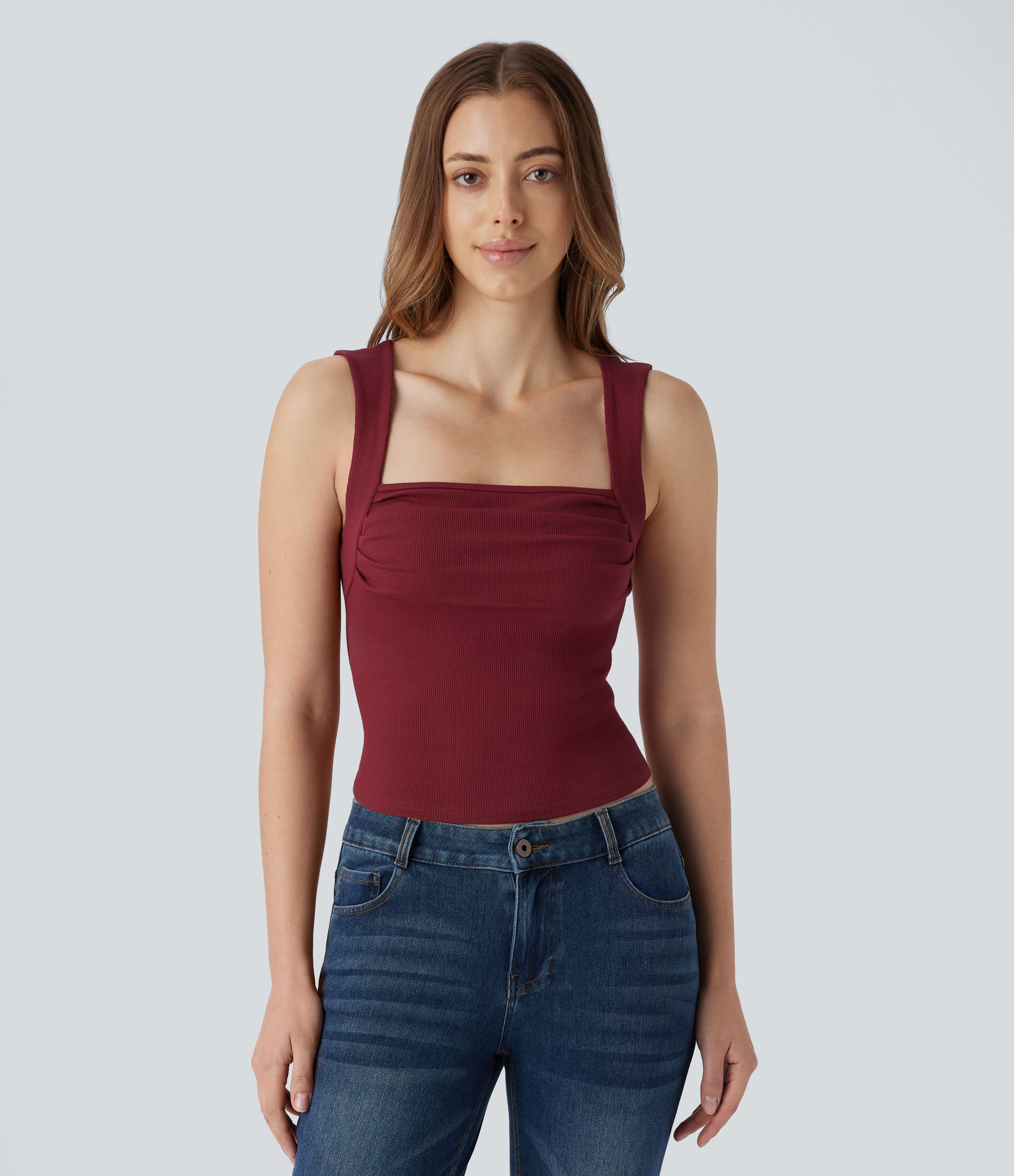 Geripptes, eckiges Ausschnitt, gerüschtes 2-in-1-Tanktop mit schmaler Passform