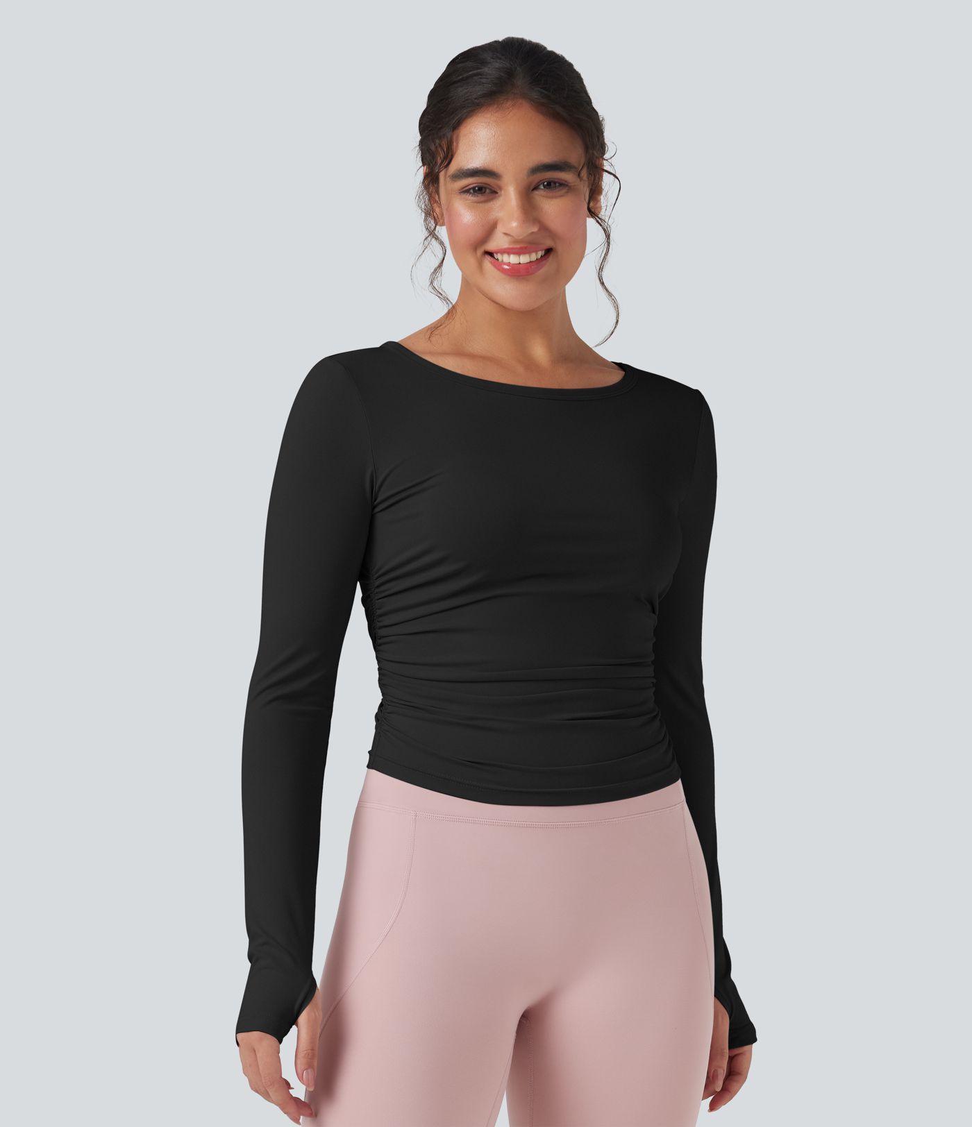 Gerafftes Yoga-Sport-Top mit Rundhalsausschnitt, langen Ärmeln und Daumenlöchern