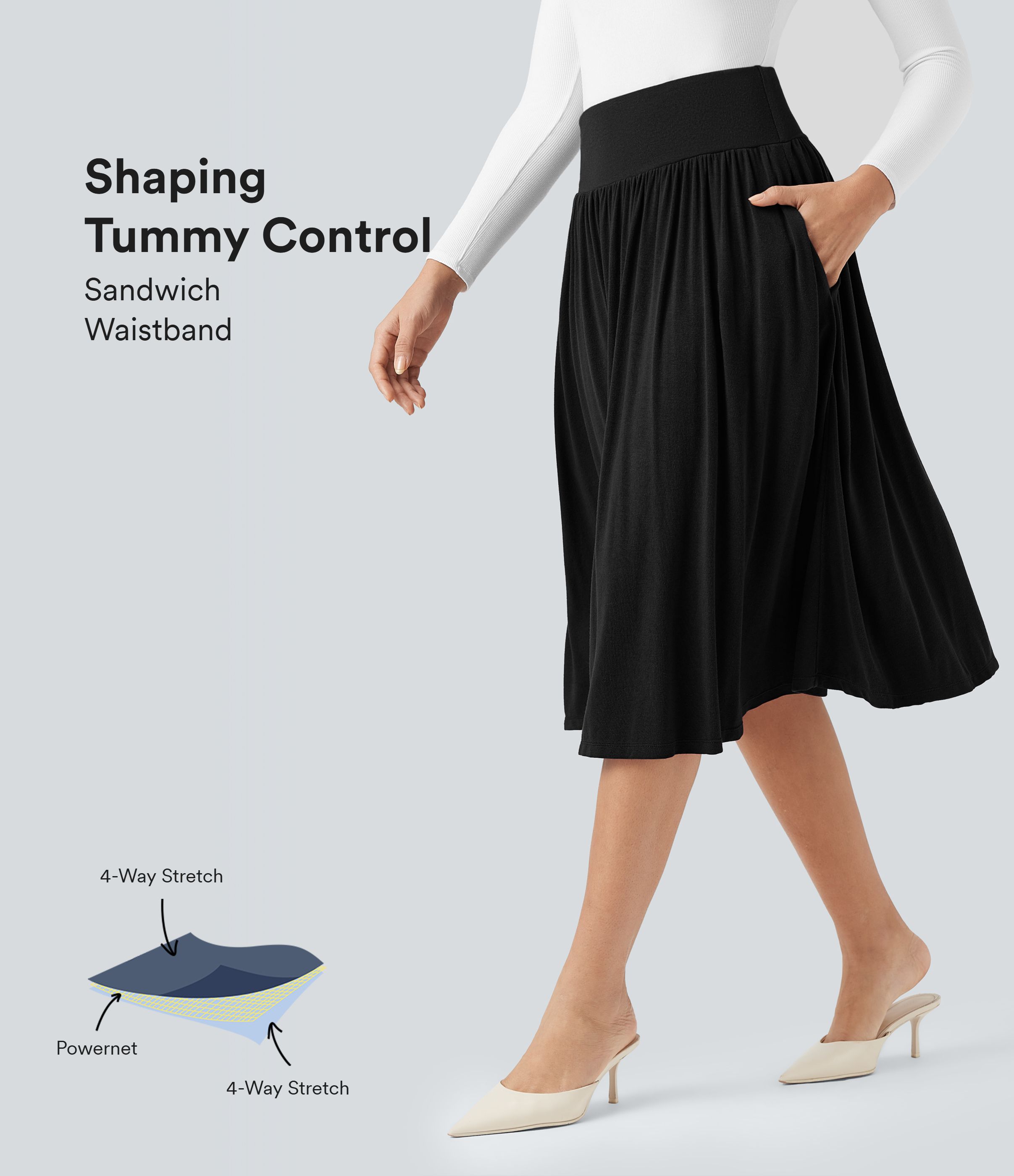 Lässiger, fließender Midirock mit hohem Bund, Seitentaschen und Bauchkontrolle