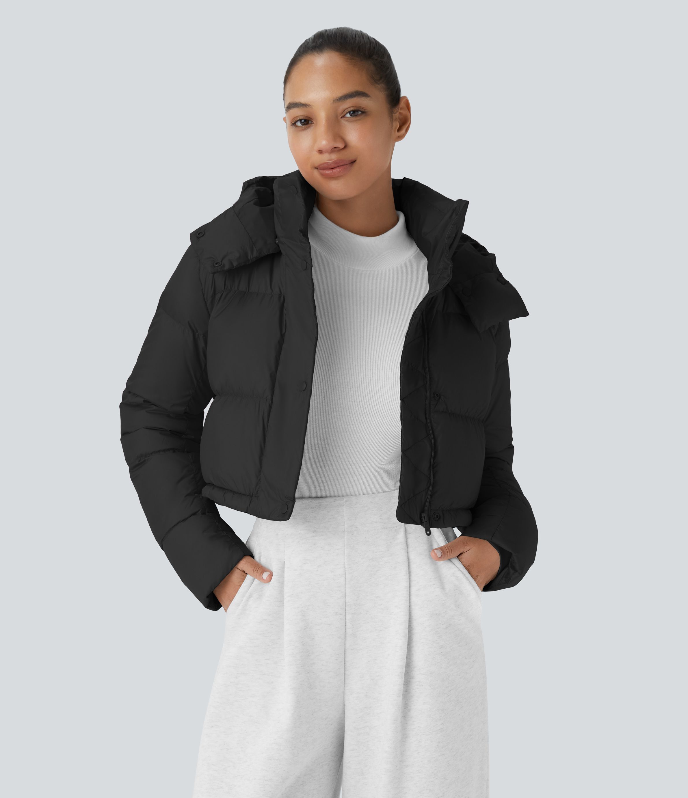 Lässige, wasserabweisende Puffer-Daunenjacke mit abnehmbarer Kapuze, Knöpfen, langen Ärmeln, unsichtbaren Taschen und Kordelzug