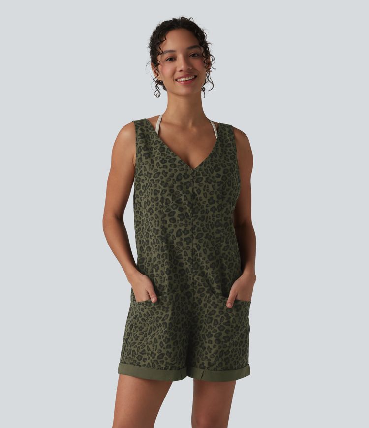 Lässiger, kurzer Overall mit Seitentaschen, verstellbaren Trägern, Leopardenmuster und umgeschlagenem Saum