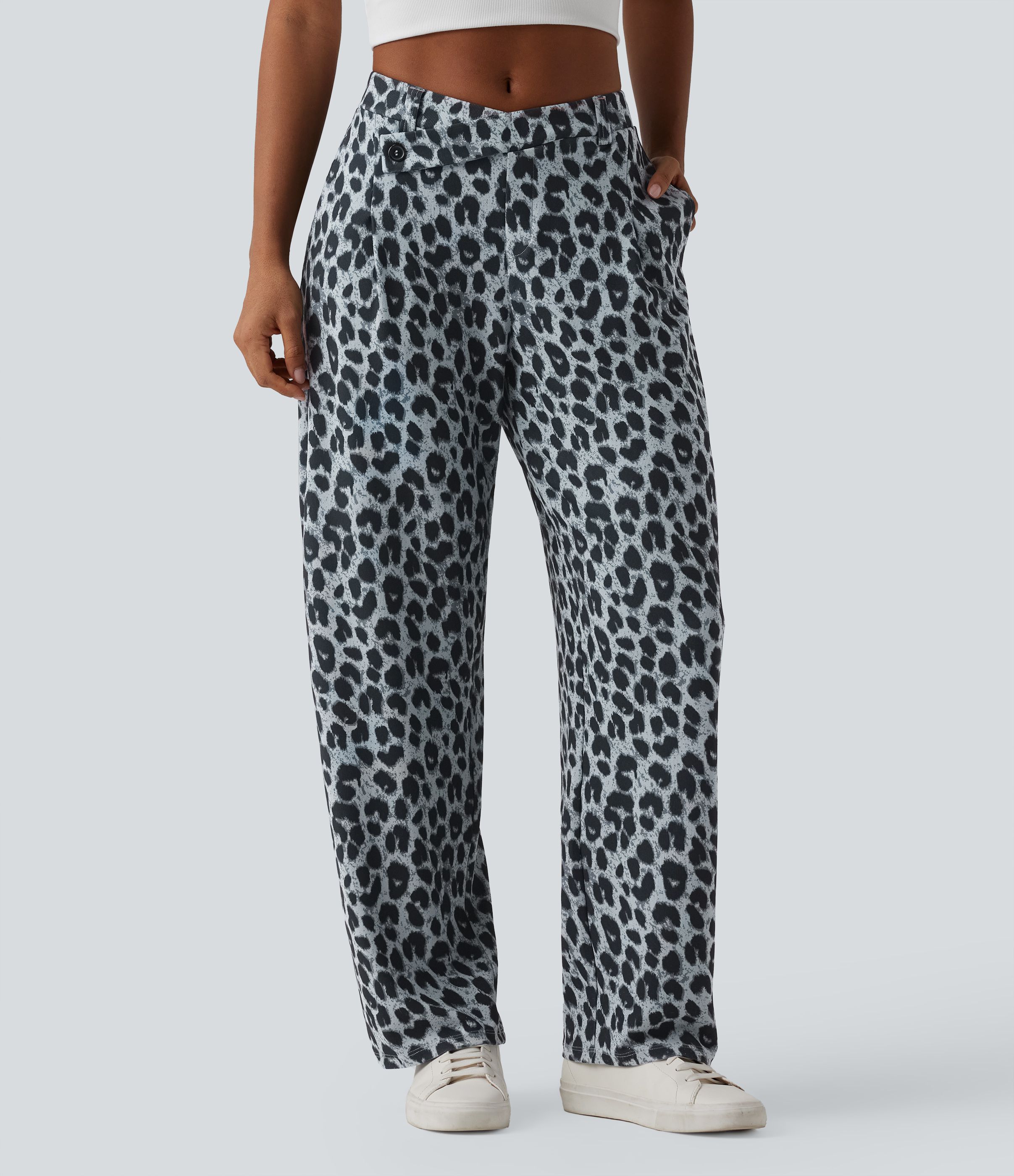 Schmal zulaufende Arbeits-Hose mit mittelhohem Bund, Seitentaschen, Leopardenprint und Waffelstoff