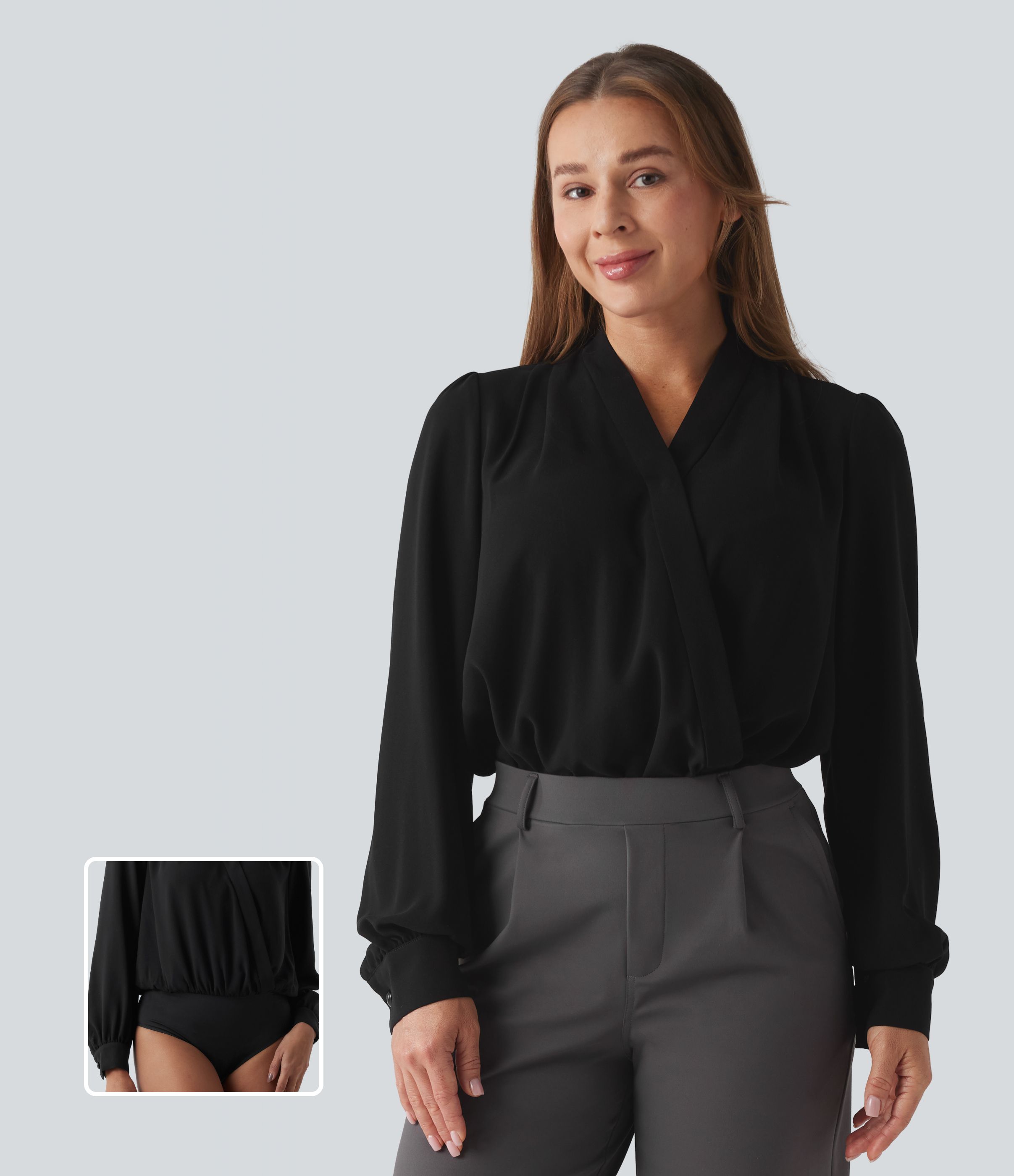 Work bodysuit with long sleeves and crossover design
