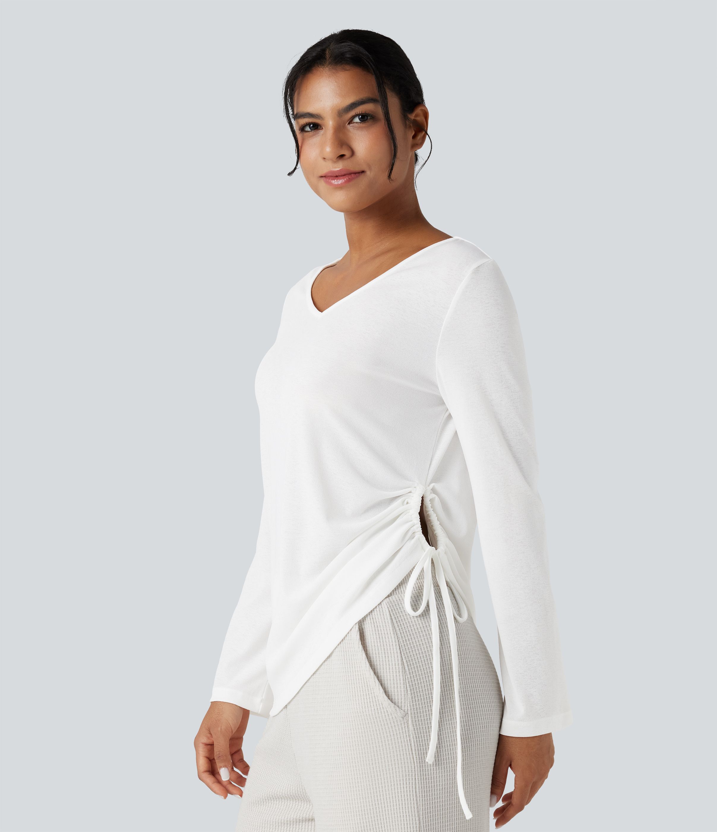 Lässiges Oberteil mit tiefem V-Ausschnitt, langen Ärmeln und Kordelzug am Saum