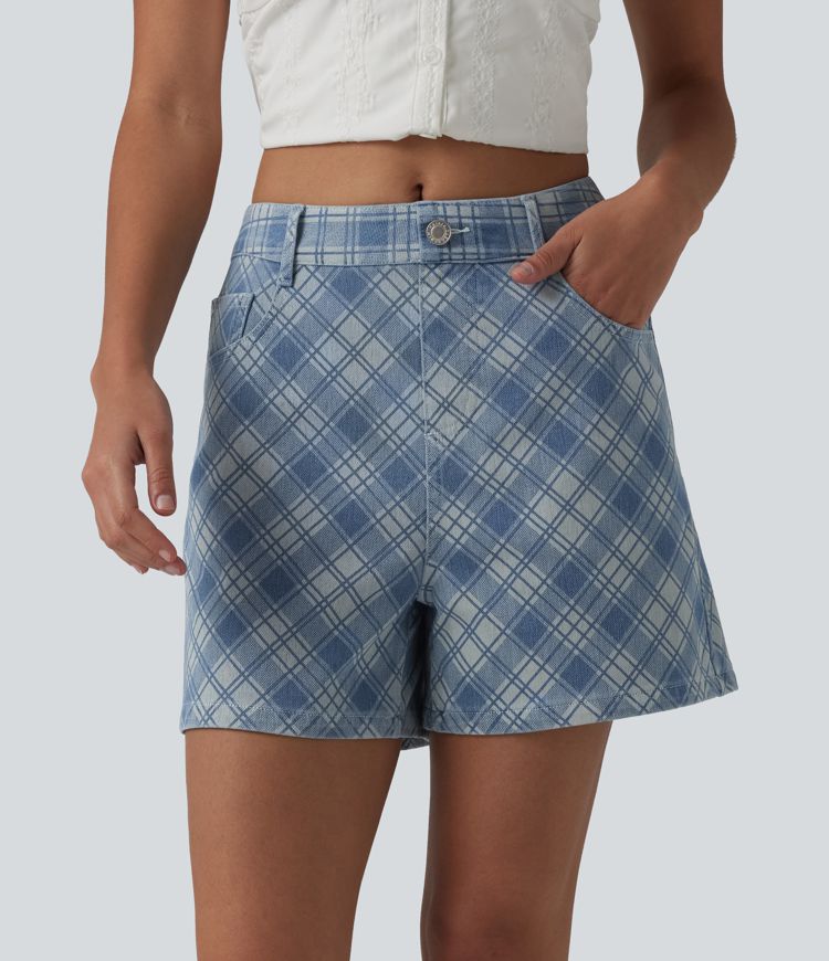 Halara Flex™ - Lässige Shorts aus Denim mit mittelhohem Bund, mehreren Taschen und Karomuster - 10,2 cm