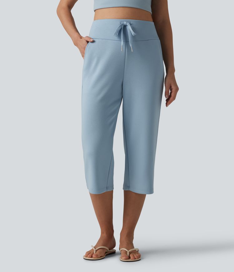 Lässige Capri-Hose mit hohem Bund, Seitentaschen, Kordelzug und geradem Bein