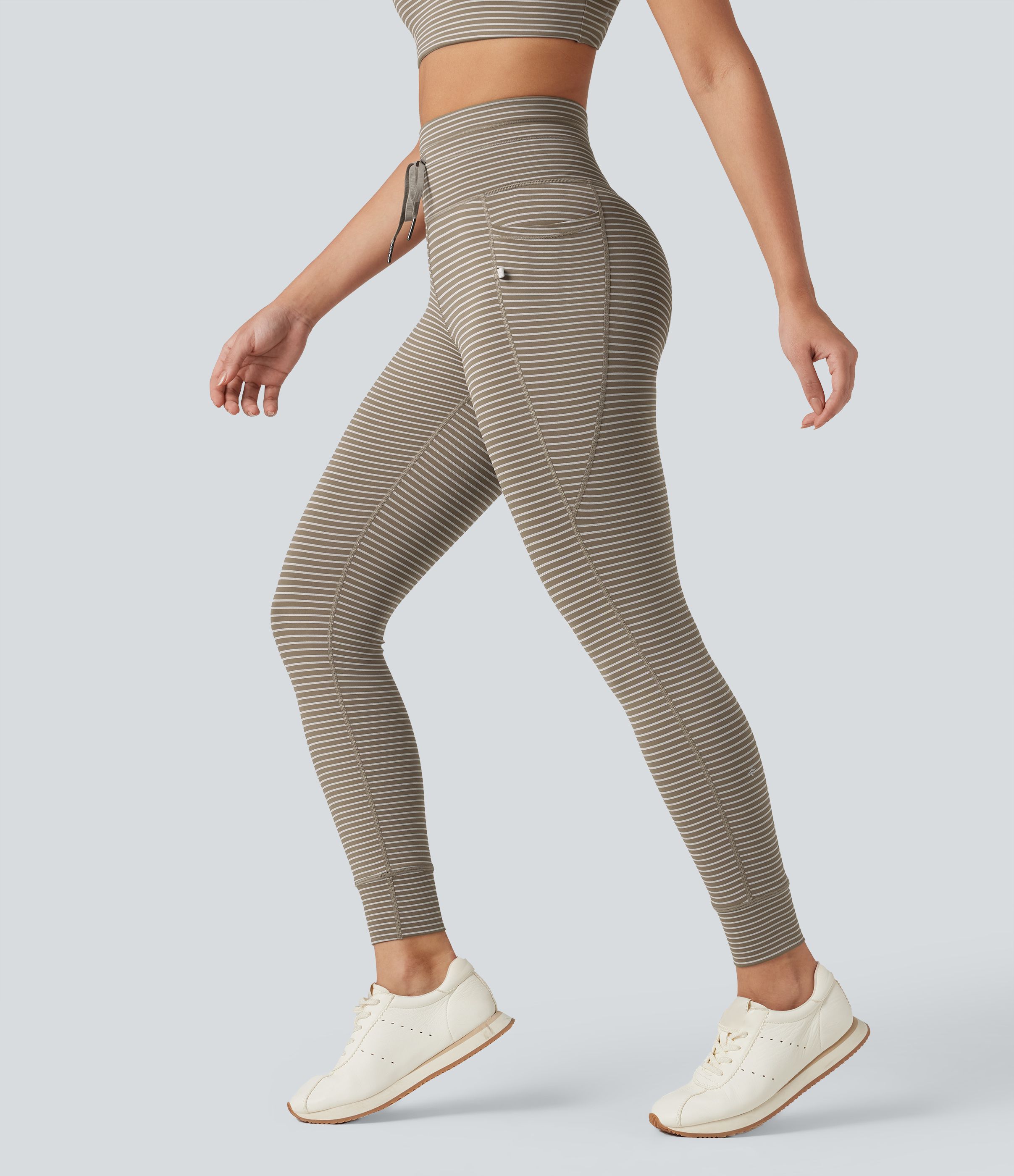Gestreifte Yoga-Leggings mit hohem Bund, Seitentaschen und Kordelzug