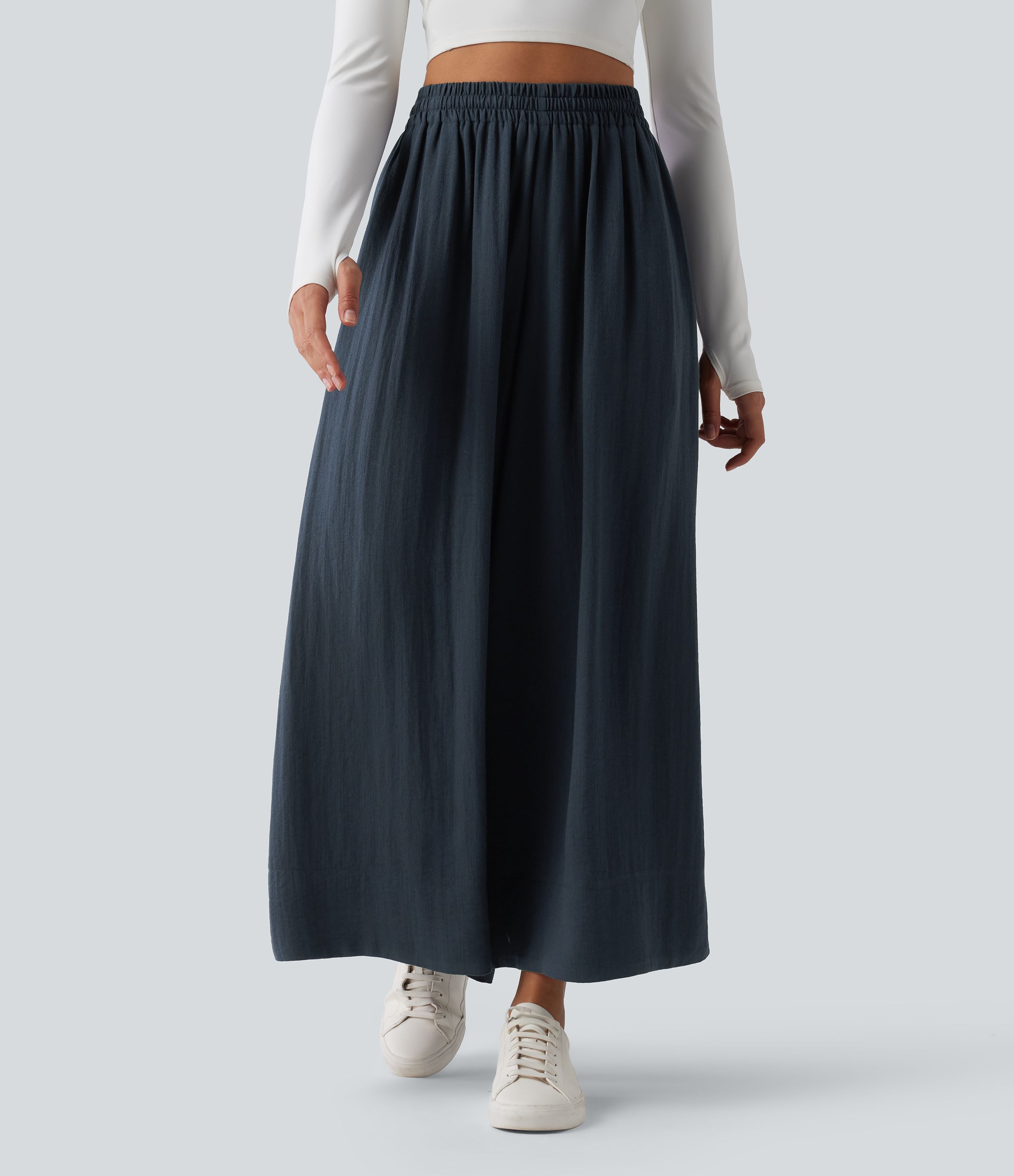 Lässige, fließende Hose mit hohem Bund, mehreren Taschen, Kordelzug und weitem Bein