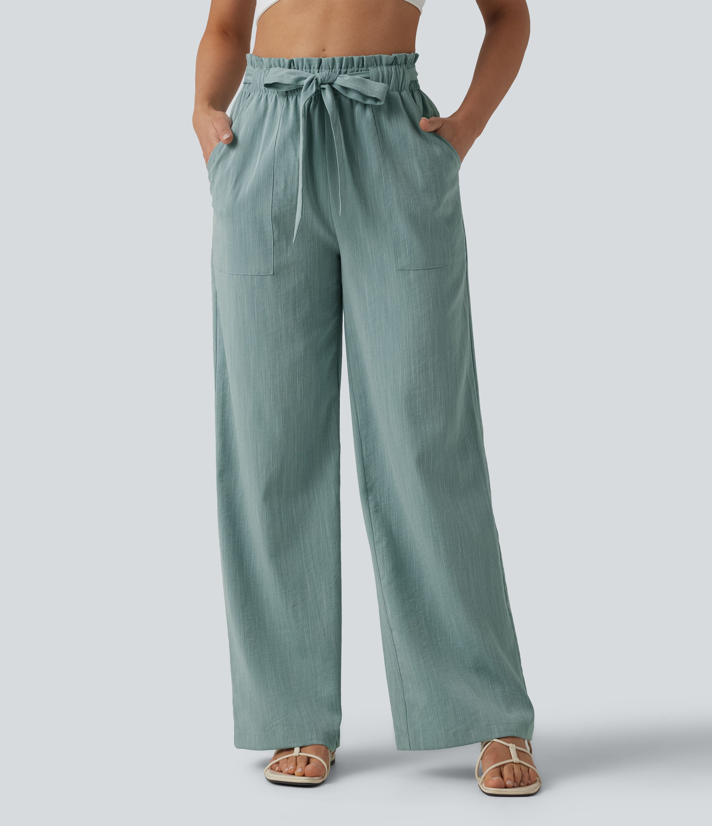 Lässige Hose in Leinenoptik mit hohem Bund, Seitentaschen, Gürtel, Rüschensaum und geradem Bein