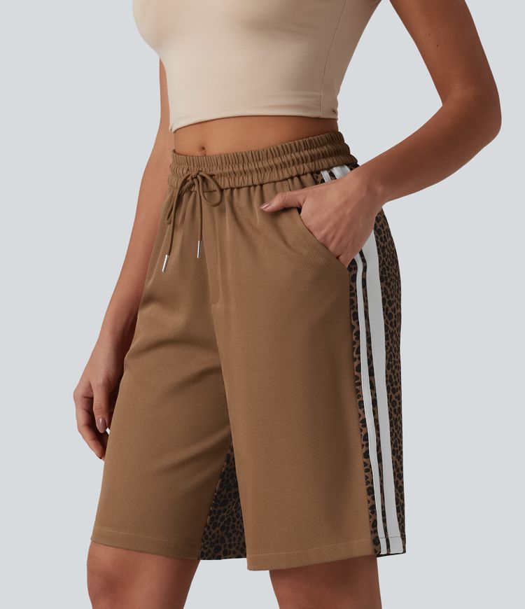 Lässige Baggyy-Shorts mit mittelhohem Bund, mehreren Taschen, Kordelzug, Leopardenmuster, Streifen und Farbblock - 25,4 cm
