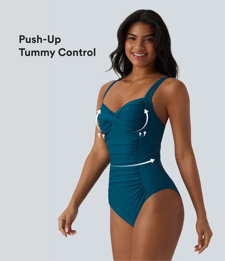 Geraffter Badeanzug mit Queen-Anne-Ausschnitt, verstellbaren Trägern und Bauchkontrolle - Push-Up
