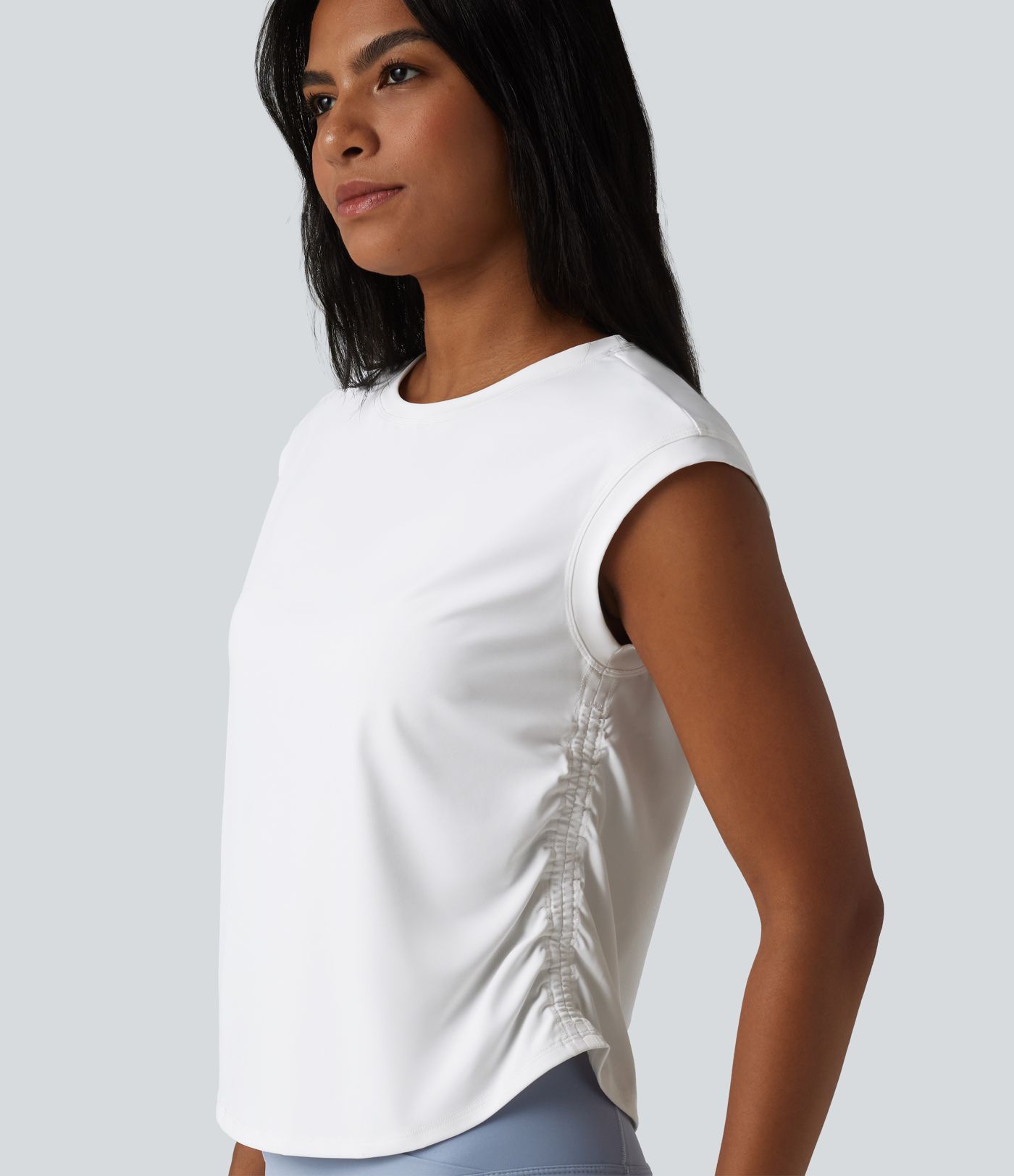 SoftlyZero™ - Gerafftes Yoga-Sport-Top mit Rundhalsausschnitt, kurzen Flügelärmeln und abgerundetem Saum