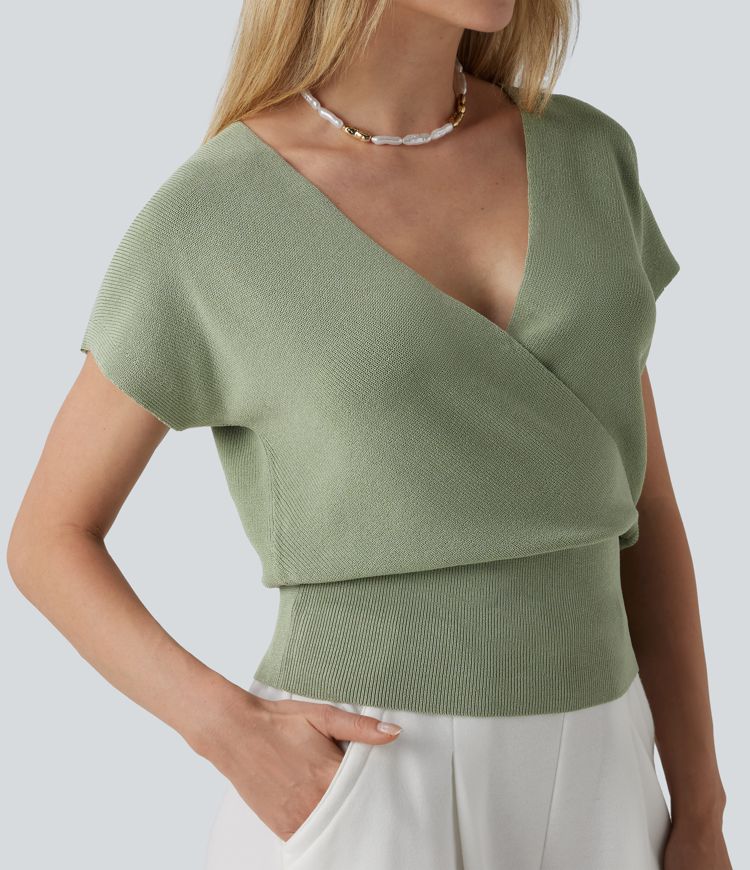 Lässiger Pullover mit überkreuztem V-Ausschnitt und kurzen Ärmeln