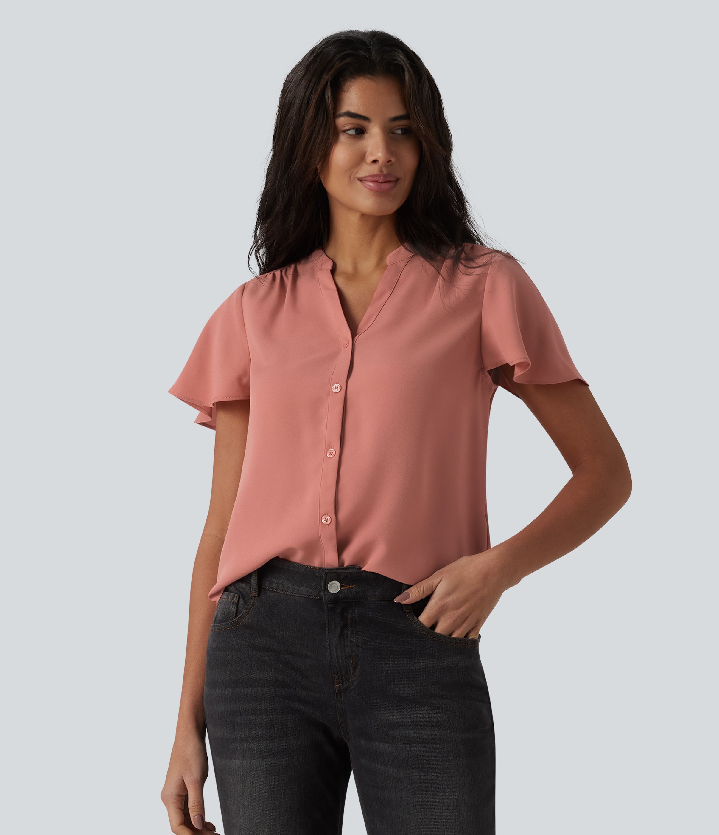Casual blouse with a V-neck, flounced sleeves and a rounded hem.